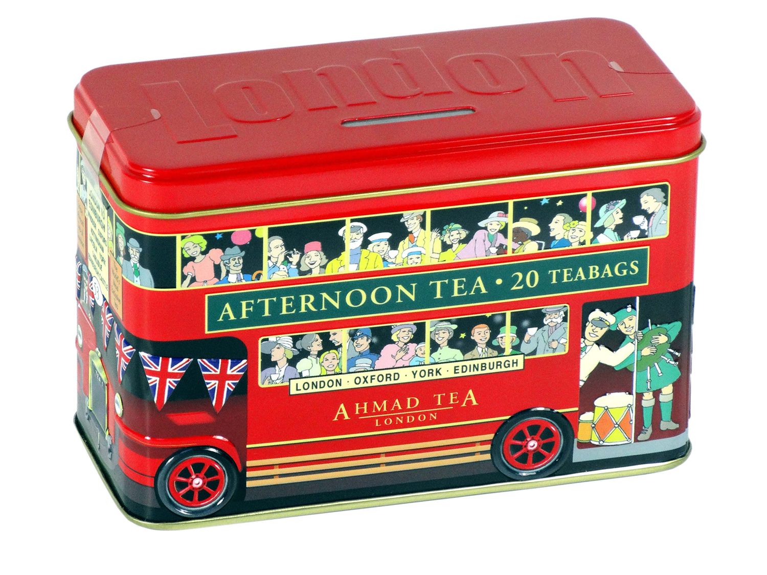 The classic london bus collectible coin bank with 20 foil wrapped English Breakfast tea bags. The lid has a slit to save coins.