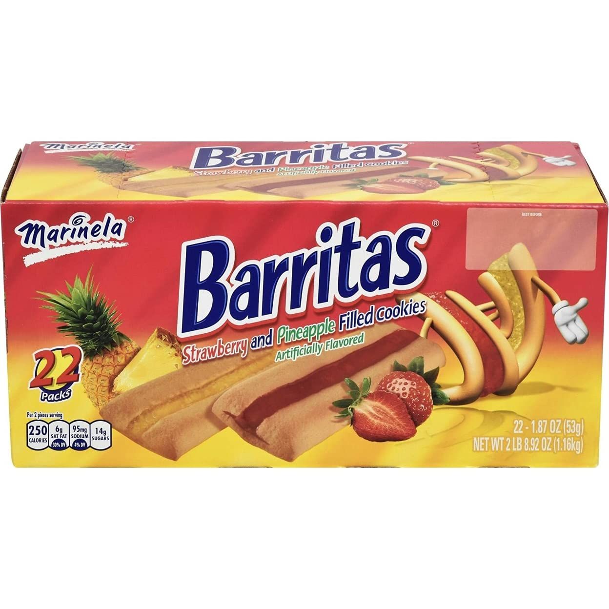 Description Marinela Barritas filled with Pineapple or Strawberry. Naturally and Artificially Flavored.