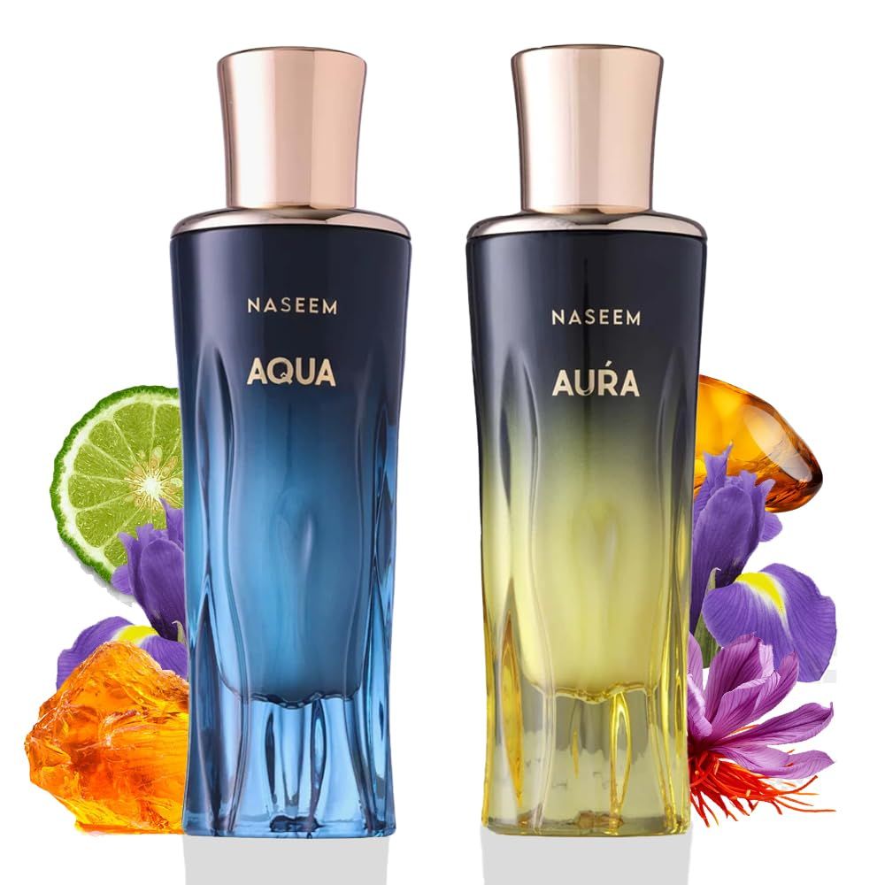 Naseem Aqua Perfume & Naseem Aura Aqua Perfume - 80ml Each, Unisex FragrancesDiscover the refreshing and long-lasting scents of Naseem Aqua Perfume and Naseem Aura Aqua Perfume. Both 80ml, alcohol-free, and hypoallergenic, these unisex fragrances are perfect for any occasion.Aqua Perfume blends salty ocean water, citrusy ginger and grapefruit, and warm Ambroxan, creating a fresh, invigorating scent that lasts all day.Aura Aqua Perfume combines floral rose and jasmine, with rich agarwood and white musk, offering a subtle and luxurious aroma for sensitive skin.Both perfumes last up to 15 hours, are water-based, and come in elegant packaging, making them ideal for daily wear or special events.