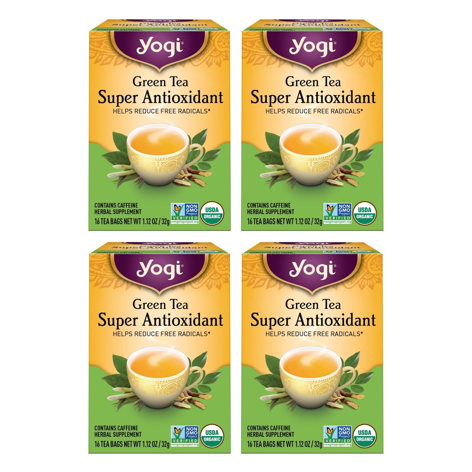 "This luscious organic Green Tea is specially formulated to supply potent antioxidants and support your overall health. With every sip, you'll enjoy a select blend of organic Green Tea and Grapeseed Extract, two natural powerhouses known for their antioxidant benefits.brbrThe distinctive flavor profile of this antioxidant tea is as unique as it is delicious. Bright, citrusy Lemongrass adds a refreshing note, while Licorice and Jasmine Green Tea lend sweet and floral tones. This harmonious combination results in a tea that's both rejuvenating and fragrant, making each cup a sensory delight. Plus, with 15 mg of caffeine per tea bag, it offers a gentle energy lift to kickstart your day or give you a mid-afternoon boost.brbrFrom the first sip to the last, you'll appreciate the smooth flavor. The high-quality packaging ensures freshness and convenience, perfect for enjoying at home or on the go. So, whether you're seeking a beverage to support your overall health or simply to enjoy a relaxing moment, Yogi Green Tea Super Antioxidant is your perfect choice.brbrFor over five decades, weve been making delicious, functional teas inspired by the ancient holistic healing philosophy of Ayurveda. Our diverse tea selection supports everyday well-being with specialized herbal formulas thoughtfully blended for both health benefits and appealing flavor.brbrYogi is a Certified B Corporation producing more than 40 tea blends from over 100 organic spices and botanicals sourced from around the globe. With every ingredient we source, and every tea bag we make, we strive to support environmental sustainability and social responsibility. We do so by following highly selective sourcing standards, performing rigorous quality tests, mandating environmentally sound farming practices, and partnering with local communities. Through such partnerships, we want to empower our entire tea ecosystem to live healthy, vibrant lives."